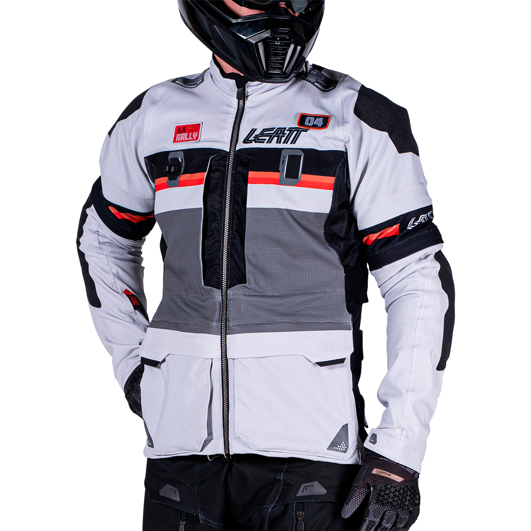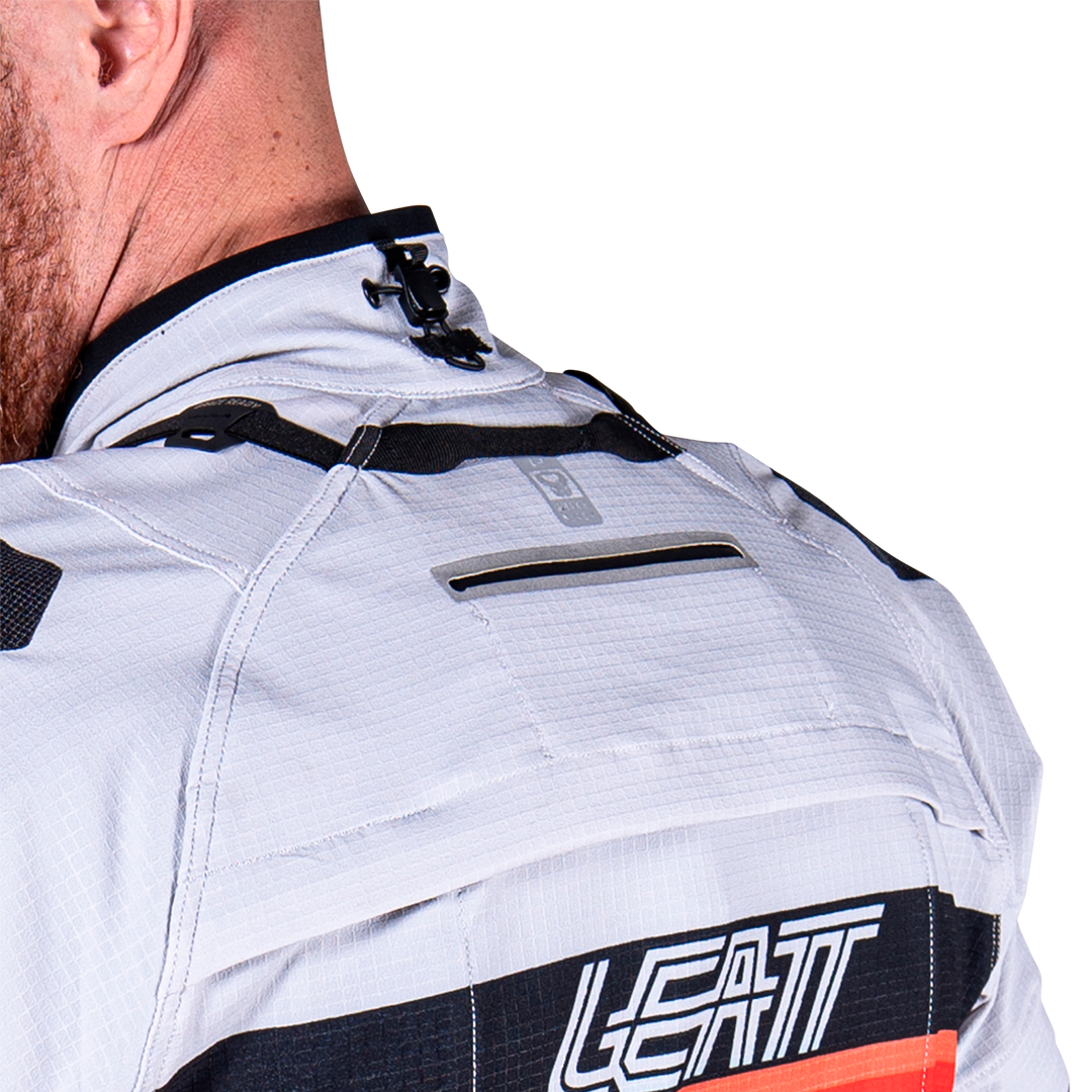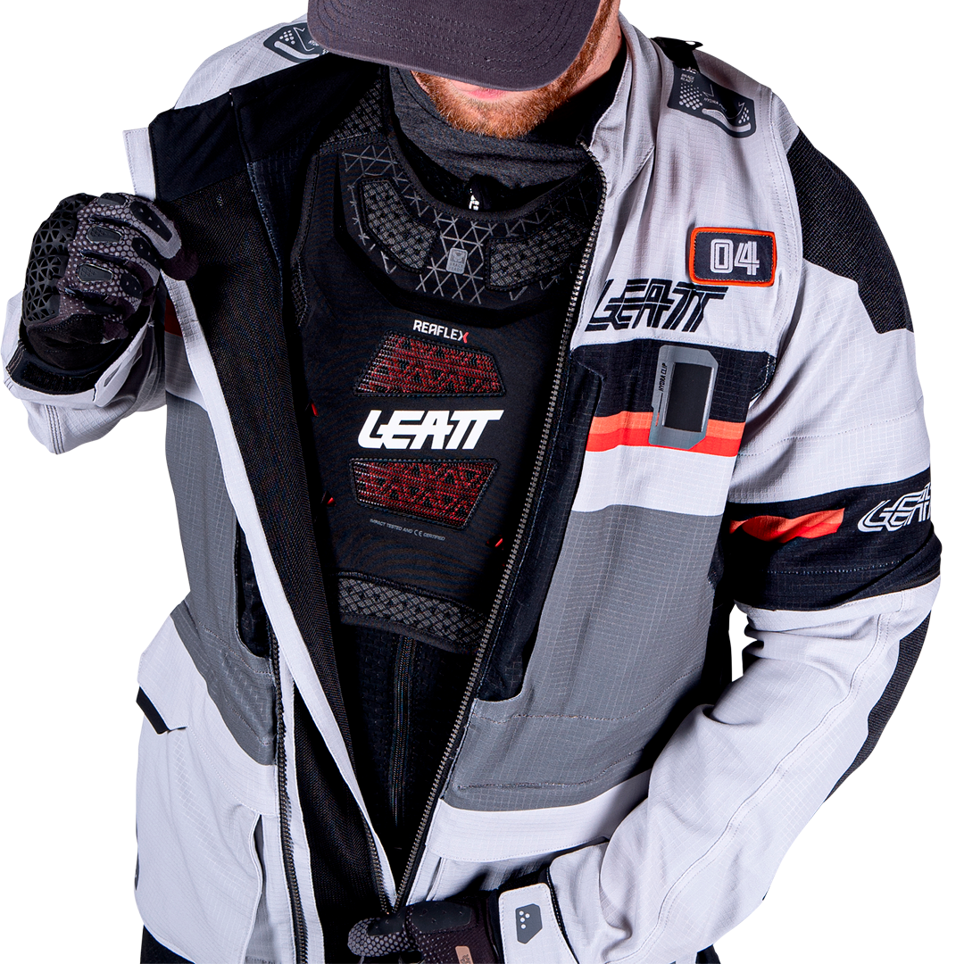 chaqueta textil trail/adventure con forro interior y protecciones extraíbles CE Nivel 1, diseño 4‑direcciones Ripstop, ventilación avanzada (mangas desmontables + múltiples entradas de aire), bolsillos impermeables, bolsillo para sistema de hidratación de 2 L, ajuste ergonómico, compatibilidad con collarín, detalles reflectantes. Perfecta para rutas mixtas y cualquier clima.