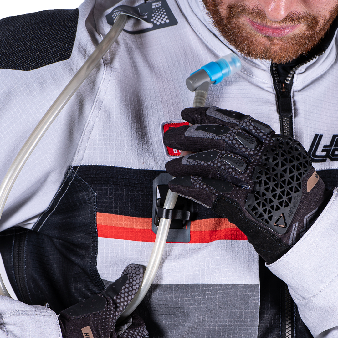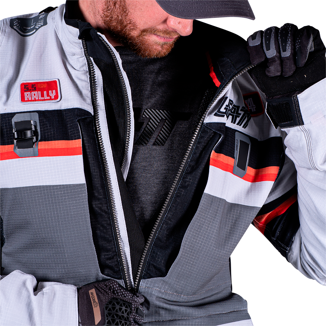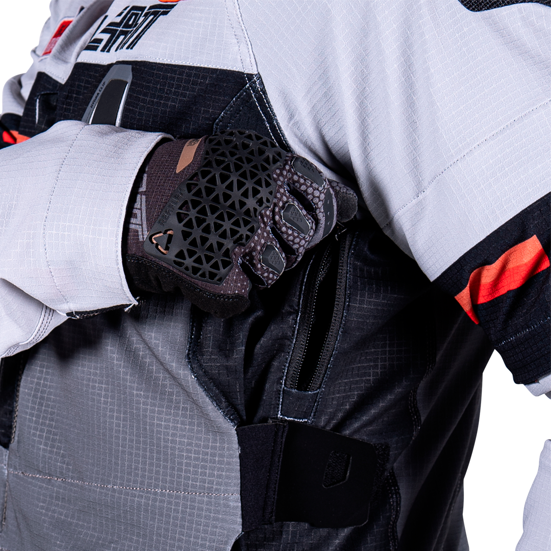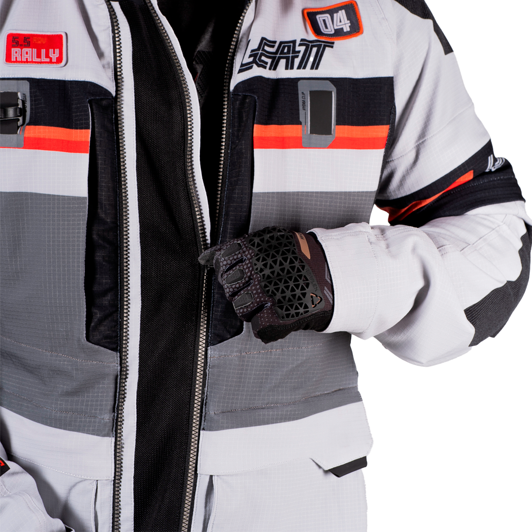 chaqueta textil trail/adventure con forro interior y protecciones extraíbles CE Nivel 1, diseño 4‑direcciones Ripstop, ventilación avanzada (mangas desmontables + múltiples entradas de aire), bolsillos impermeables, bolsillo para sistema de hidratación de 2 L, ajuste ergonómico, compatibilidad con collarín, detalles reflectantes. Perfecta para rutas mixtas y cualquier clima.