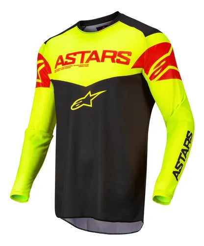 Jersey Alpinestars Fluid Tripple en colores negro, amarillo fluorescente y rojo.