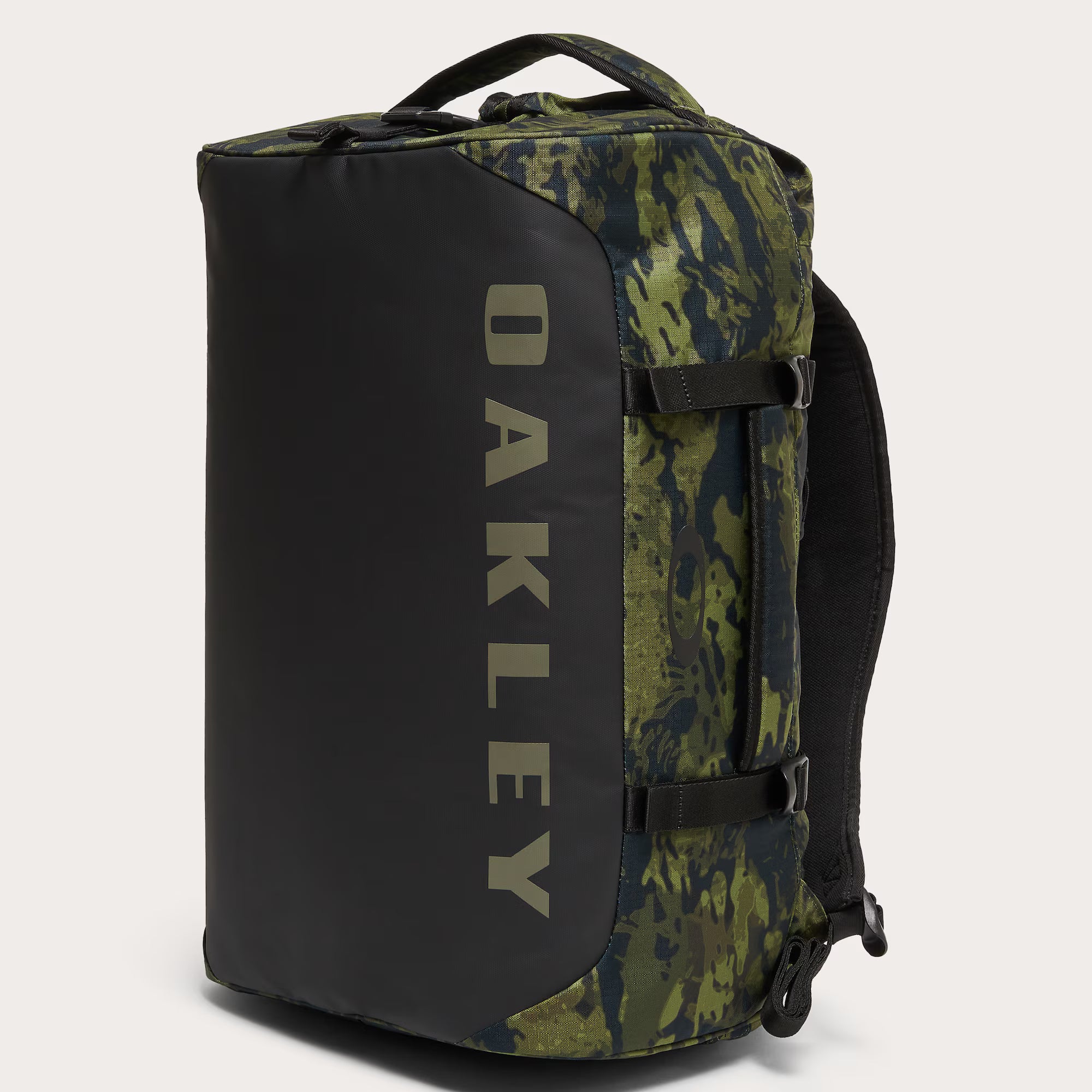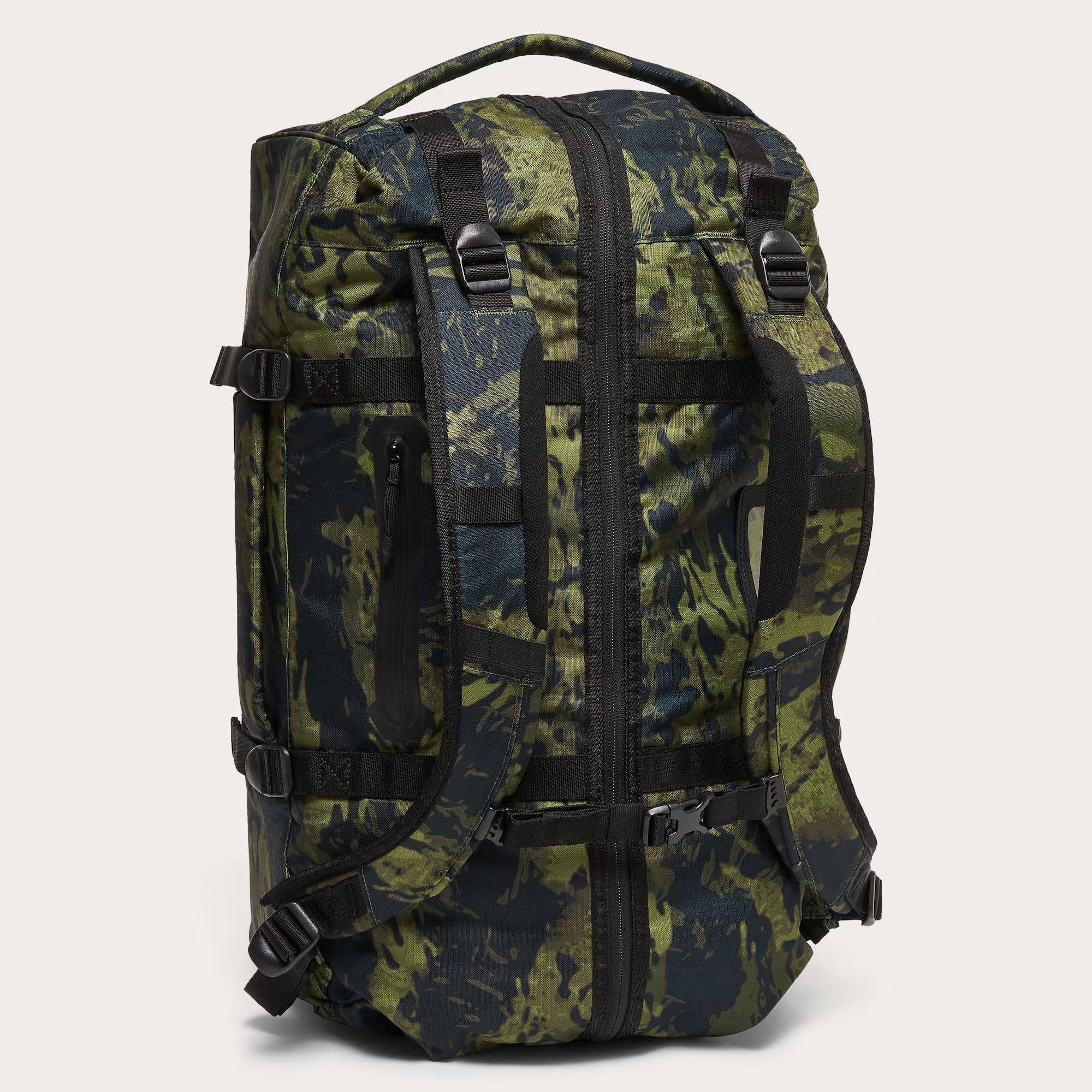 Maleta tipo duffle con diseño camuflaje verde, ideal para viajes y aventura.