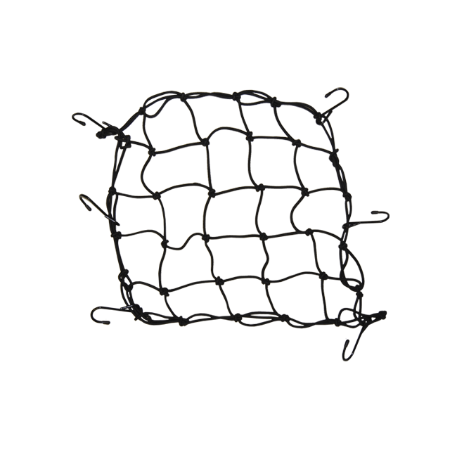 Red elástica negra diseñada para sujetar cascos con seguridad.